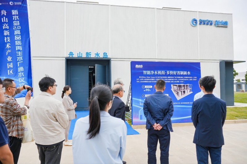 通水儀式結(jié)束后,與會人員共同實(shí)地考察了新水島 2.0 水廠。該項(xiàng)目占地面積僅 300 平方米,采用金科環(huán)境自主研發(fā)的 “新水島 2.0” 工程模塊化產(chǎn)品與 “水蘿卜 AI 智能體” 運(yùn)營管理平臺,以污水處理廠出水為水源,通過 “超濾 + 反滲透” 先進(jìn)處理工藝,使供水水質(zhì)遠(yuǎn)超《城市污水再生利用 — 工業(yè)用水水質(zhì)》標(biāo)準(zhǔn),完全滿足國內(nèi)外光伏企業(yè)高標(biāo)準(zhǔn)生產(chǎn)用水需求。項(xiàng)目總設(shè)計(jì)產(chǎn)水規(guī)模達(dá) 2 萬噸 / 天,其中一期產(chǎn)水規(guī)模 5000 噸 / 天,服務(wù)范圍覆蓋舟山高新區(qū)內(nèi)新能源、化工等重點(diǎn)工業(yè)企業(yè),目前一期產(chǎn)出的再生水已主要供應(yīng)園區(qū)內(nèi)光伏企業(yè),為當(dāng)?shù)匦履茉串a(chǎn)業(yè)發(fā)展注入了綠色動力。