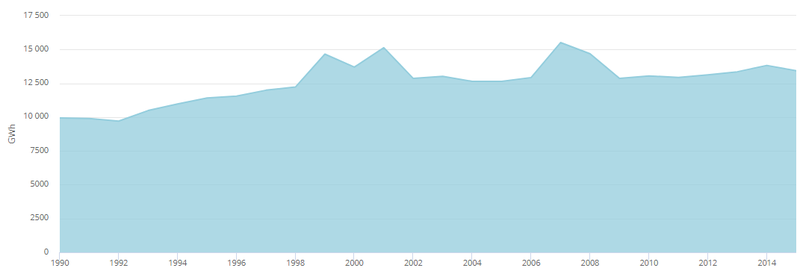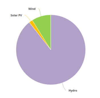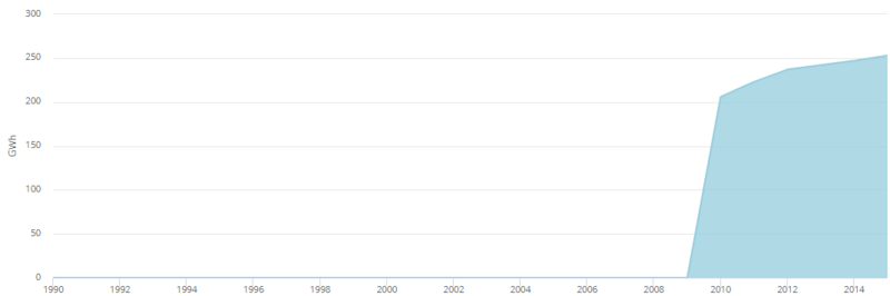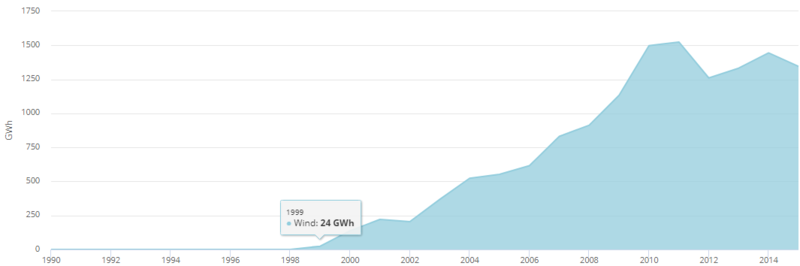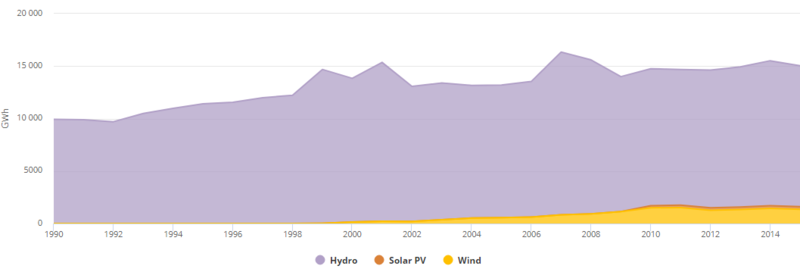 2012年,可再生能源發電量達到14,855 GWh [18],占總發電量的9.04%。水力發電裝置產生13,358吉瓦時(8.13%),而風力發電又貢獻了1,260吉瓦時(0.77%)和太陽能光伏發電237吉瓦時(0.14%)。
